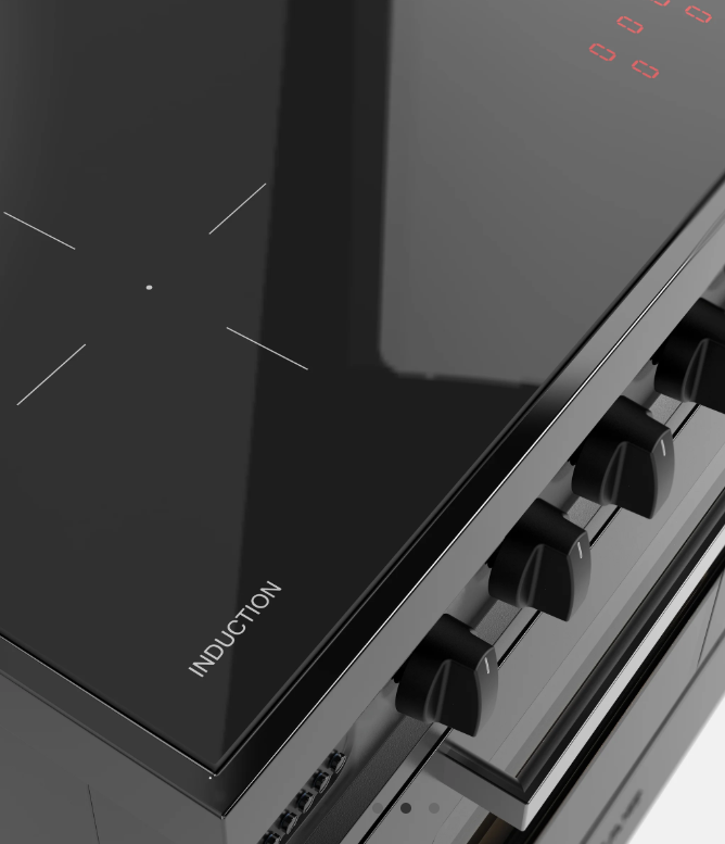 This model combines dual A-rated ovens with five-zone induction cooking. The 65-litre main oven offers nine functions (30-300°C), while the 43-litre secondary oven provides four functions (50-250°C) with rotisserie spit. Both feature soft-closing triple-glazed doors and easy-clean interiors. The induction hob includes five zones from 160mm (1.4-2.0 kW) to 265mm (3kW) for precise, efficient cooking. Finished in stainless steel or graphite matt, this 90cm range cooker represents the pinnacle of modern cooking technology.